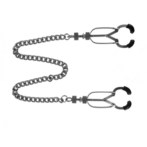 Designed for precision and strength, the Bauhaus Nipple Vice comes to you with two clamps that can be adjusted to your desired level of tightness with the adjusting screws located at the base. The tips are covered in soft TPR with the addition of a delicate curve at the very end that assists in gripping the skin of your subject. Ending this commanding piece is the addition of a 12 inch connecting chain that looks oh so enticing as it hangs from the captive nipples of your plaything. Each clamp measures 3 inches in length and opens to 0.5 inches wide.
