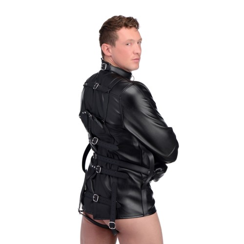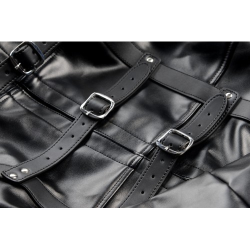 Completely restrain your sub to have your way with them! This unisex straight jacket allows you to trap your plaything with classic medical play fetish wear. Just slip your partners arms into the heavy-duty, leather-like sleeves and tighten the 5 secure buckles up the back. The dual crotch straps provide a tighter fit on both male and female bodies. Cross their arms in front of them and buckle the arm straps together behind them. A final strap wraps around their arms in the front and through loops in the jacket, providing a locking buckle that will keep your submissive completely immobilized until you are done playing with them. An O-ring on the collar allows you to attach a leash or other BDSM accessories. Restrict your sub and make them obey your every bidding!
