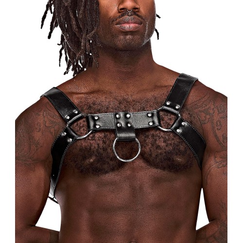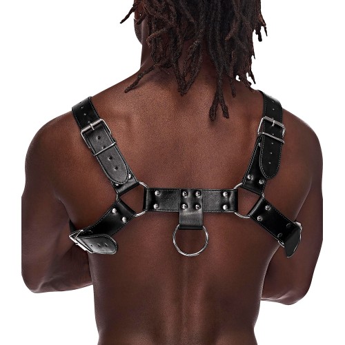 Single leather harness with adjustable metal buckles, attached rings,and decorative metal studding.