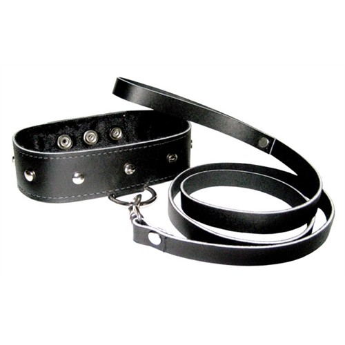 Genuine leather adjustable metal studded collar with metal D-ring and matching quick-clip leash. Take control on your fantasy situations in style.
