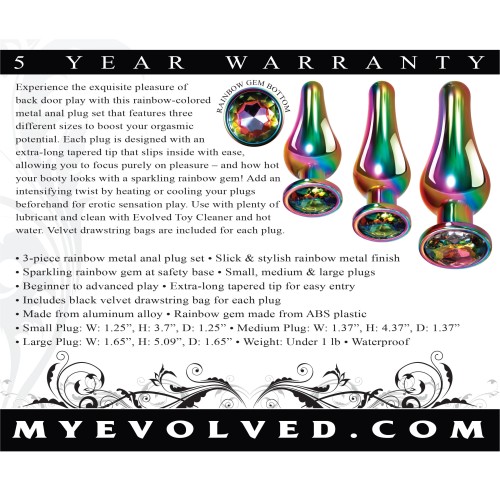 Experience the exquisite pleasure of back door play with this rainbow-colored metal anal plug set that features three different sizes to boost your orgasmic potential. Each plug is designed with an extra-long tapered tip that slips inside with ease, allowing you to focus purely on pleasure, and how hot your booty looks with a sparkling rainbow gem! Add an intensifying twist by heating or cooling your plugs beforehand for erotic sensation play. Use with plenty of lubricant. Velvet drawstring bags are included for each plug.