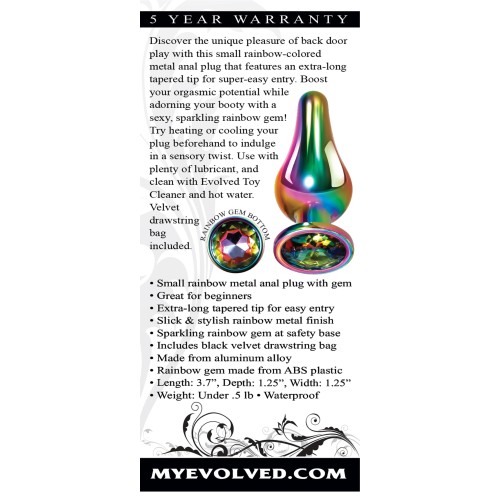 Discover the unique pleasure of back door play with this small rainbow-colored metal anal plug that features an extra-long tapered tip for super-easy entry. Boost your orgasmic potential while adorning your booty with a sexy, sparkling rainbow gem! Try heating or cooling your plug beforehand to indulge in a sensory twist. Use with plenty of lubricant. Velvet drawstring bag included.