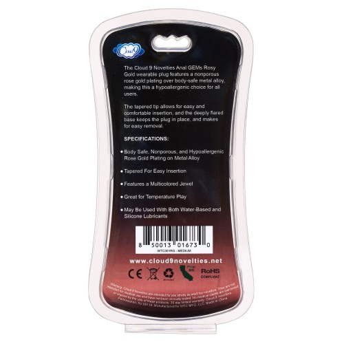 The Could 9 Novelties Anal Gems Rosy Gold wearable plug features a nonporous rose gold plating over body-safe metal alloy, making this a hypoallergenic choice for all users. The tapered tip allows for easy and comfortable insertion, and the deeply flared base keeps the plug in place and makes for easy removal.