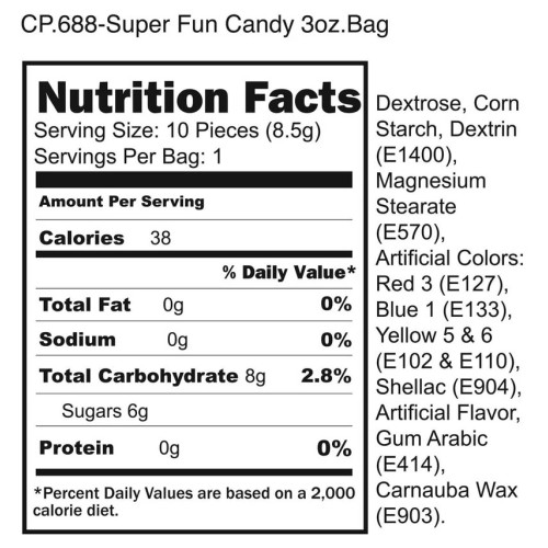 Ingredients: Glucose, Magnesium Stearate, Glucose Syrup, Maltodextrin, Citric Acid, Artificial Flavors, Carnauba Wax, Artificial Colors: Yellow 5, Red 40, Blue 1